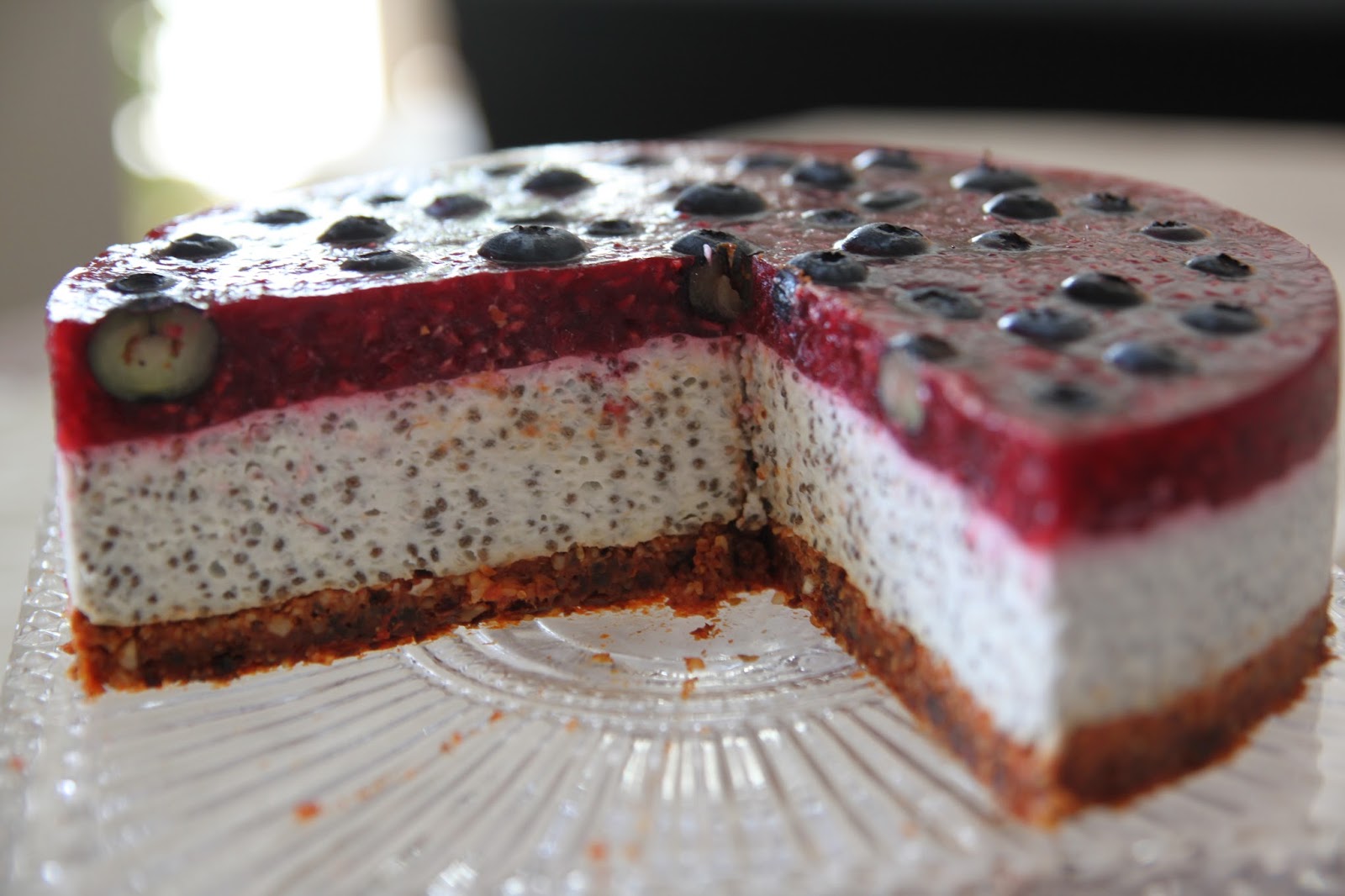 Spód z bakalii, masa serowa pełna zdrowych nasion chia a na wierzchu mus a może raczej galaretka z malin….